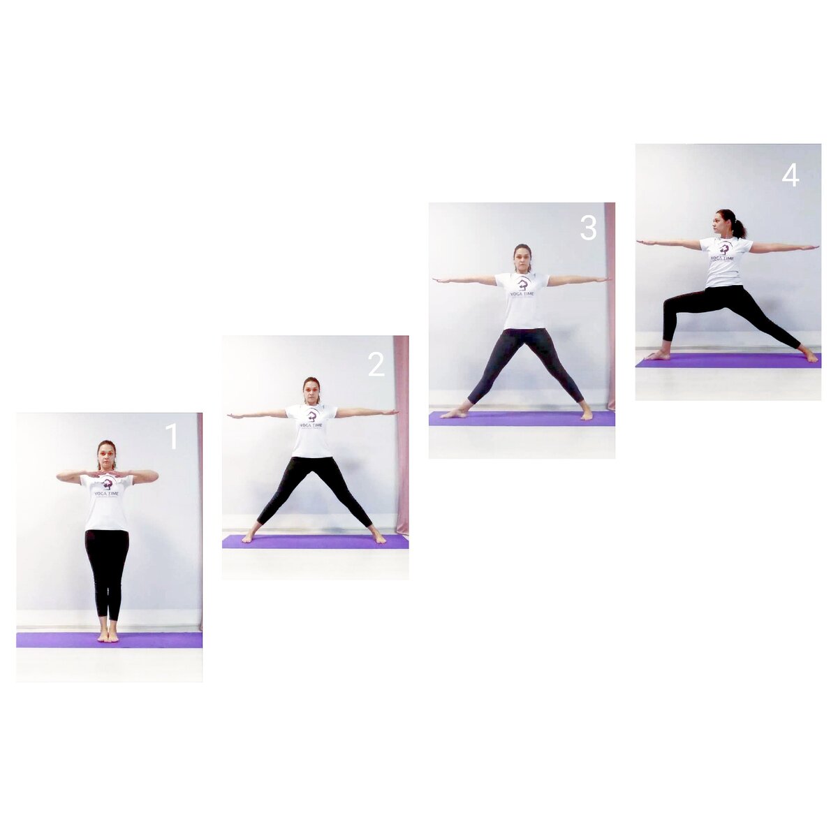 Намасте друзья 🙏 ⠀ Рубрика #пошагам и сегодня это Вирабхадрасана II (поза воина 2) ⠀ В переводе с санскрита: вира – «воин», бхадра – «благой», асана – «положение тела». ⠀ Техника выполнения: 1️⃣Встаньте в Тадасану. ⠀ 2️⃣ Прыжком или шагом расставьте ноги широко, на расстоянии примерно 1,2 м. Ступни должны находиться на одной линии, пальцы ног направлены вперед. Поднимите руки до параллели с полом, ладони должны смотреть в пол. Держите пальцы прямо и вытянутыми. ⠀ 3️⃣Поверните правую стопу на 90 градусов, а левую немного внутрь. Подтяните бедра и убедитесь, что центр переднего бедра, колено и стопа находятся на одной линии. Убедитесь, что вес вашего тела находиться на правой пятке. Левая нога вытянута и напряжена в колене. Держите таз направленным вперед. ⠀ 4️⃣ Согните правую ногу в колене, до тех пор, пока бедро и икра не образуют прямой угол, а правое бедро не станет параллельно полу. Поверните голову направо. Полностью вытяните руки. Растяните обе руки от плеч до кончиков пальцев. Н
