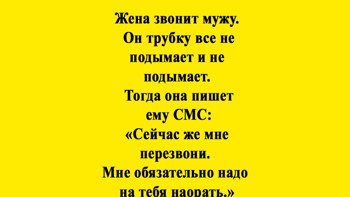 Жена звонит мужу. Он трубку все не подымает и не подымает. Тогда она пишет ему СМС: «Сейчас же мне перезвони. Мне обязательно надо на тебя наорать.»