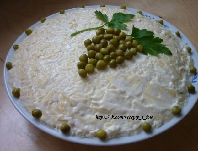 Смазываем рис майонезом, украшаем салат зеленью или еще чем-то, что есть в вашем холодильнике. Приятного аппетита!
