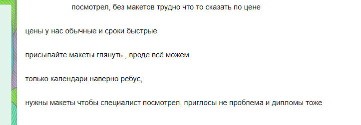 Предновогодняя пора, все типографии загружены под завязку, огромное количество макетов в печать, и ещё больше продукции на выдачу. Я думала, что меня в этом году минует эта суматоха. Я работаю в бюджетной организации и всё у нас чётко, подарки уже вот-вот будут готовы к выдаче. И тут выясняется, что волею судьбы мне нужны сдать в печать заказ для "не нашей типографии". Я с ними не работала никогда и тут, нате вам. Новая типография как новые отношения, нужно пройти момент "притирки", "первых ссор и обид" и радости встречи. Я написала в ту самую типографию, назовём её А, а менеджера в ней М. Два дня менеджер М мне не отвечал на запросы по стоимости и срокам. Я не выдержала и позвонила им. Услышала в ответ: - А, да, я видел ваше письмо, но что-то не ответил. Сейчас отвечу. Через пару минут мне пришло письмо на почту со следующим содержанием: Сказать, что я валялась под столом в истерике, не сказать ничего. "Цены у нас обычные и сроки быстрые" - самый гениальный ответ менеджера в типогра