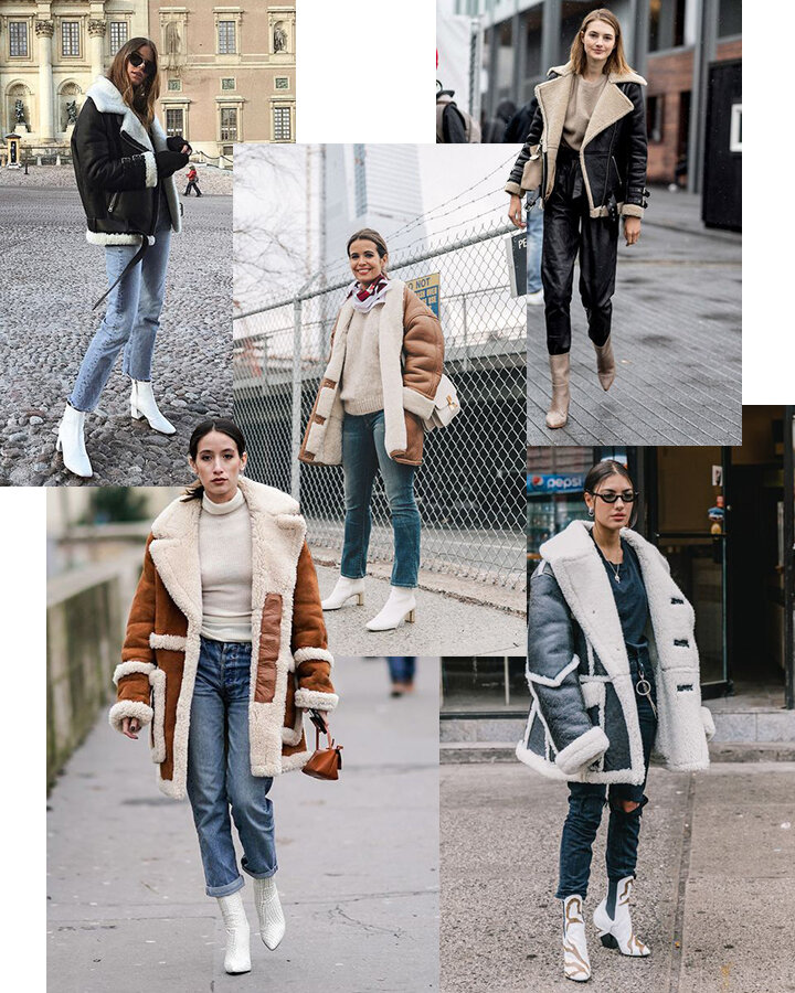Дубленка более демократичный вид зимней одежды, чем шуба. Она может быть натуральной или искусственной, в тренде – дубленки авиаторы и косухи. Эти модели имеют длину до середины бедра или чуть ниже, свободный крой, воротник и могут напоминать кожаные куртки-косухи. Дубленки смотрятся эффектно за счет комбинирования разных цветов меха и верха дубленки, впрочем, даже однотонные материалы выглядят интересно благодаря разной фактуре. С белыми ботильонами Хороший способ оживить дубленку – надеть ее с голубыми или синими джинсами и белыми ботильонами. Подойдут как модели на блочном каблуке, так и казаки. Цвет обувь поддержит светлую меховую изнанку дубленки. Если белый кажется вам слишком не зимним, замените его бежевым. Так, бежевые казаки с черными брюками и дубленкой со светлым мехом смотрятся намного мягче. С темными ботильонами Джинсы, короткая дубленка-косуха и ботильоны на каблуке – удобный повседневный вариант. Если выбираете объемную дубленку-авиатор, предпочтите более толстый ка