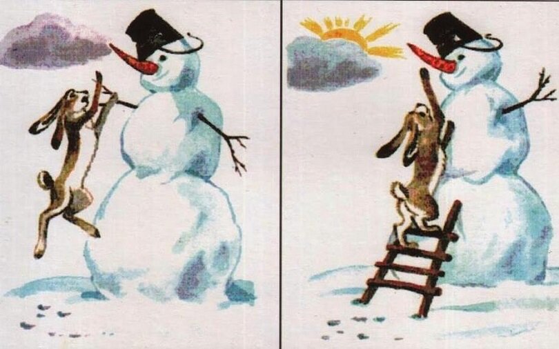 Автор На картинке сидел ничего не подозревающий заяц. Удобно устроившись на лестнице, подперев лапой подбородок, в «роденовской» позе, смотрел вдаль. В будущее, предсказывая судьбы. Оракул в этот раз был с коротким хвостом и длинными ушами. Дети раскладывали картинки, стараясь понять последовательность. «Что сначала, а что потом», — напоминала я инструкцию к тесту, помогая интонацией, одобрительным кивком головы. Незатейливая история про зайца была задумана автором теста, рассчитанного на 5-7-летний возраст детей. Голодный заяц, прыгая (на первой картинке), с помощью лестницы (на второй картинке), старается достать морковь у снеговика, заменяющую нос. На третьей картинке (как я называю ее «предсказательной»), заяц сидит на лестнице, подперев лапой мордочку. А на последней, четвертой, выходит солнце, снеговик тает и заяц ест морковь. Вот и все. И далеко не все… Сколько же трагедий / экшенов / комедий / триллеров происходит вокруг этой серии картинок! Дети невольно переносят на зайца с
