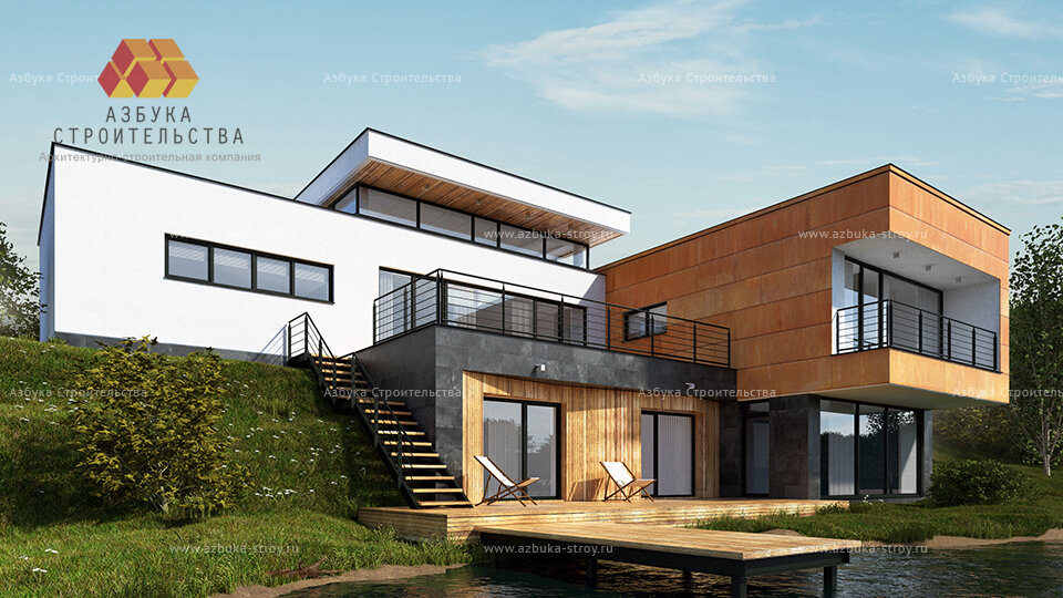 Интересный рельеф – смелая архитектура Заказчика может напугать сложный рельеф участка, талантливого архитектора только порадовать. Какой простор для творчества! Это особняк для ярких людей, в характере – смелость, уверенность в себе и высокий внутренний ранг. При переселении в этот дом можно отринуть все лишнее, очистить жизнь от ненужных вещей и мыслей, начать с чистого листа. Внутренняя планировка – простор и загадочность Со стороны основного фасада коттедж выглядит обманчиво просто, в поле зрения только один этаж – невысокий, белые стены, перпендикулярные линии, отсутствуют вычурные элементы. Владелец не стремится показать окружающим свой высокий статус. Размах дома открывается не для всех, им можно насладиться только из приватной зоны, скромно закрытой от посторонних глаз. Это дом-сюрприз, знакомиться с ним - как смотреть хорошую пьесу. Интрига начинается при подъезде: не может быть особняк такого человека столь умеренным. Компактная прихожая наводит на пренебрежительную мысль