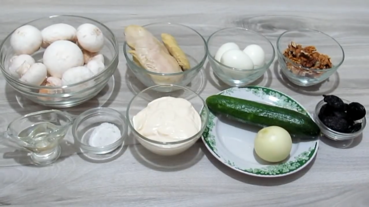 Всем привет! Сегодня готовим салат, который мне нравится прежде всего за потрясающее сочетание курицы, чернослива и грецкого ореха, ну и как всегда покажем как оригинально можно будет его оформить. Готовить будем из: Свежий шампиньоны - 300-350 гр. Отварная куриная грудка - 200-250 гр. Отварные яйца - 3-4 шт. Грецкий орех - 50-70 гр. Чернослив - 50-70 гр. Свежие огурцы - 200-250 гр. Свежий репчатый лук - 1 средняя шт. Майонез Соль по вкусу Растительное масло для обжаривания ингредиентов Начинаем готовить Нарезаем грибы Затем лук После этого обжариваем Обжаренные шампиньоны и лук отставляем в сторону и даём остыть Нарезаем курицу Огурец Далее чернослив Перетираем на крупной тёрке яйца И нарезаем ножом орехи "Собираем" салат Как всегда использую круглую форму для выпечки Первый слой из курицы, заправляем майонезом. Майонезом заправляю каждый слой, поэтому в дальнейшем писать о нём не буду, не забывайте периодически подсаливать Укладываем чернослив Далее остывшие грибы с луком Огурцы И яй