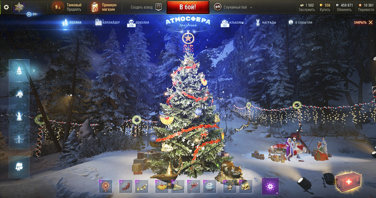 Разрабы игры "Мир танков" в последнее время были скуповаты на различные бонусы. Может, их заела совесть, а может, рейтинги Разрабов игры «Мир танков» наконец-то перестало плющить от жадности, или душившая жаба скупости лопнула! Сложно сказать, по какой это причине произошло, но «Новогоднее наступление» впервые за долгий срок стало настоящим фонтаном различных плюшек, выпадающих из малых сундуков, и открываемых за новые уровни атмосферы праздника. Боевые задачи «Новогодней суматохи» Само по себе выполнение этих задач особых заработков и фантастических бонусов не приносит. Так, несколько малых коробок. Можно, конечно, заработать и больше. Все зависит от умения воевать :) Так вот, одна из задач выполнена, заветные виртуальные коробочки получены, настало время изучить их содержимое. По большей части в них находятся новогодние украшения и различные детали интерьера для части ангара, выделенной для праздничной тусовки. Можно обнаружить елочную гирлянду или полевую кухню. Всё штучки нужно