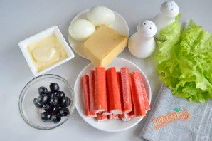 Ингредиенты: Листовая зелень (салат) — 4-5 Штук Твердый сыр — 100 Грамм Крабовые палочки — 200 Грамм Яйцо куриное — 2 Штуки Майонез — 100 Грамм Оливки черные или зеленые — 50 Грамм (без косточек) Соль, перец черный молотый — По вкусу Количество порций: 4 Как приготовить "Салат-закуска "Ёлочные шарики"" Итак, подготовьте продукты. Отварите яйца, остудите и очистите от скорлупы. Крабовые палочки освободите от целлофановых пакетиков. Оливки отцедите от жидкости. На самой мелкой терке натрите сыр, яйца и крабовые палочки. Треть массы крабовой стружки отложите отдельно для панировки шариков. Добавьте майонез. Соль и другие специи по желанию, я не добавляла ничего, даже соль, на мой вкус было всего достаточно. Хорошо перемешайте. Из сырно-крабовой массы скатывайте шарики, размер не имеет значения, делайте какие нравятся вам. Мои примерно с грецкий орех. Обваливайте каждый шарик в крабовой стружке. Выкладывайте шарики на листья салата. Оливки порежьте на половинки и каждую половинку п