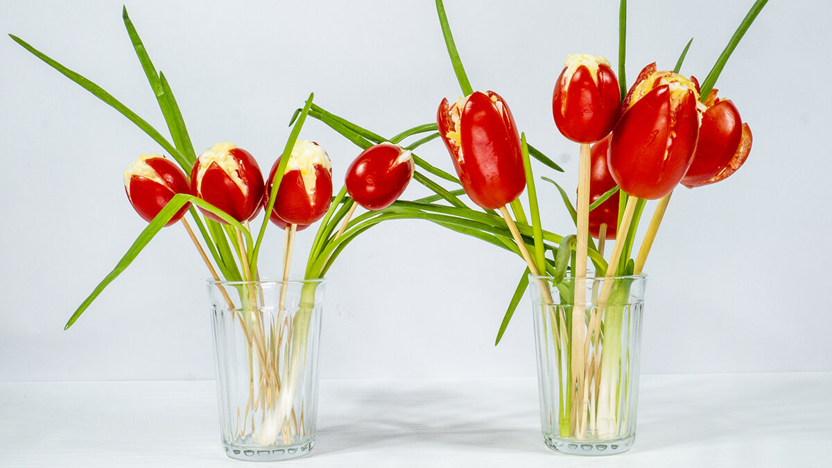Если Вы задумались, как украсить праздничный стол, смотрите данное видео. Расскажу детально как можно сделать вот такие тюльпаны из помидор. Будем сегодня делать большие и маленькие тюльпаны. Ссылка на видео рецепт https://youtu.be/NL1JBuXdG08 Для первой закуски Больших тюльпанов я мелко нарезаю 100 грамм крабовых палочек. Высыпаю в глубокую тарелку. Мелко нарезаю 2 зубчика чеснока. Натираю на крупной терке 1 вареное яйцо. Далее 100 грамм твердого сыра так же натираю на крупную терку. Добавляю в начинку 1 столовую ложку майонеза. Всё аккуратно перемешиваю. Сейчас покажу я как делаю заготовки из помидор в виде тюльпана. При покупке лучше выбирать сливовидные сорта помидор. Так как круглой формы плоды не передадут идею закуски в виде тюльпана. Делаю надрезы чуть больше половины от основной высоты помидоры. А далее буду очищать серединку помидор от семян и сока. Для этого я взяла в работу небольшую фарфоровую ложку. И таким образом заготовлю все помидоры. Кстати, если пом
