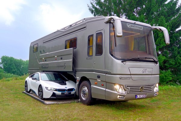 Новейший роскошный автодом The Performance S, созданный немецкой компанией Volkner Mobil, стоит 1.7 миллионов долларов и оборудован собственным гаражом для перевозки суперкаров. Также, за эти деньги вместе с 12-метровым автобусом вы получите двуспальную кровать, отапливаемую ванную комнату, полностью оборудованную кухню и просторную гостиную. Гараж для суперкара расположен в районе днища и оснащен электрогидравлическим подъемником, с помощью которого можно управлять выдвигаемой из под автодома платформой. Круглосуточное беззаботное удовольствие от путешествий - одна из важнейших особенностей Volkner Mobile. Конечно, это также включает в себя самодостаточность в совершенстве производительности: гарантируется аккумуляторы на 1500 Ач, 150 Ач для зарядки аккумуляторов во время вождения и дополнительные фотоэлектрические элементы мощностью 1 кВт. Дополнительно и опционально бесшумный дизельный генератор Fischer Panda предлагает 5 кВт дополнительной электроэнергии на борту - без потери ме