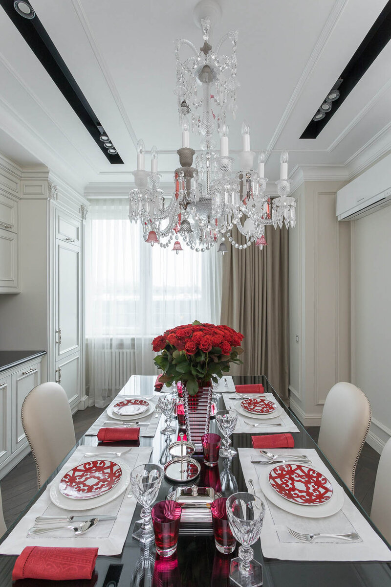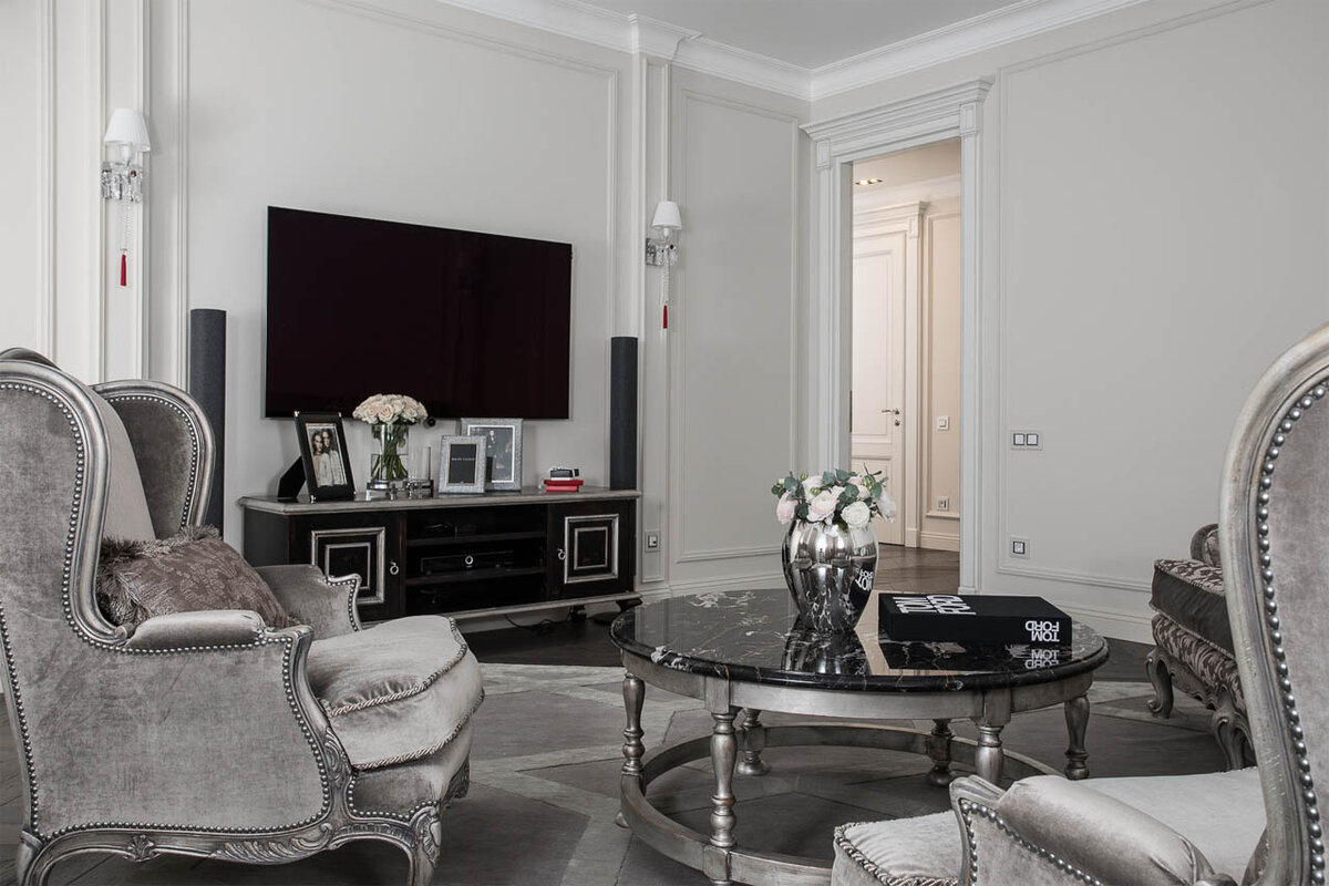 Нежнейшая классическая мелодия, в которую тонко вплетены нюансы цвета, элегантность фактур, богатство линий, звучит в этом светлом и элегантном пространстве. Ее авторы, дизайнеры Domoff Interiors, соединили традиции и современные приемы, создав великолепный образец классического стиля в его актуальном прочтении. https://archidom.ru/ Эта просторная квартира, предназначенная для проживания троих человек, воплощает в себе лучшие черты классического направления: традиционную планировку, выразительные линии, благородные материалы, сдержанную палитру. Гостиная за счет наличия нескольких окон выглядит очень светлой и нарядной. Точкой равновесия в ее композиции стал круглый стол с роскошной мраморной поверхностью, вокруг которого разворачивается остальной интерьерный сценарий: мягкая группа, изумительная в своих линиях и дымчатых оттенках, и решенная на контрасте зона ТВ. Симметрия, строгие молдинги, темный дубовый паркет – неотъемлемые атрибуты классического стиля делают помещение элегант