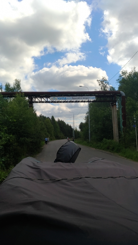 Первый экипаж, отправившись пораньше, еще и посетил Беломорские петроглифы, о чем нам в восхищенных красках рассказал в Пушном на "последней нормальной " заправке НТК по пути. Там мы заполнили все наши канистры и баки. И скоро уже поселок Чупа встретил нас задорным банером и старинной колокольней