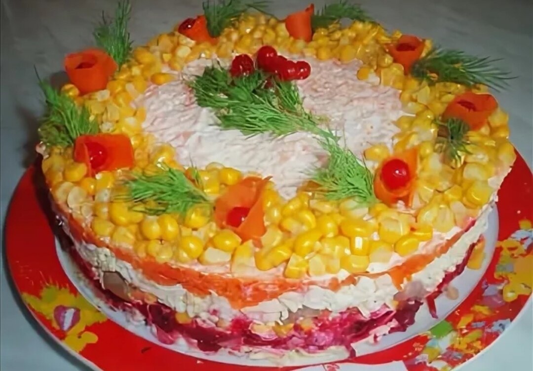 Салат "Татьяна" Ингредиенты. Филе куриное (отварное) — 1 шт Сыр твердый (примерно) — 100 г Ветчина — 200 г Шампиньоны (маринованные) — 200-250 г Морковь (вареная, средняя) — 2 шт Свекла (вареная, средняя) — 2 шт Кукуруза (консервированная) — 1 бан. Яйцо куриное (варенoе) — 4-5 шт Майонез Зелень (для украшения) Салат делается слоями. Салат будет красиво смотреться в прозрачной высокой салатнице. Или можно сделать так, как я: поставить на блюдо бортик от разъемной формы. 1 слой - нарезанное куриное филе (также филе можно просто порвать руками) + сеточка из майонеза. 2 слой - натертый на мелкой терке сыр + сеточка из майонеза. 3 слой - нарезанная на кубики ветчина + сеточка из майонеза. Ветчину можно заменить на любое копченое мясо. У меня, например, карбонад. 4 слой - натертая на мелкой терке свекла + сеточка из майонеза. Слой свеклы можно немного присолить. 5 слой - кукуруза + сеточка из майонеза. Кукурузу выкладываем не всю (я выложила большую часть). Остальная нам понадобится