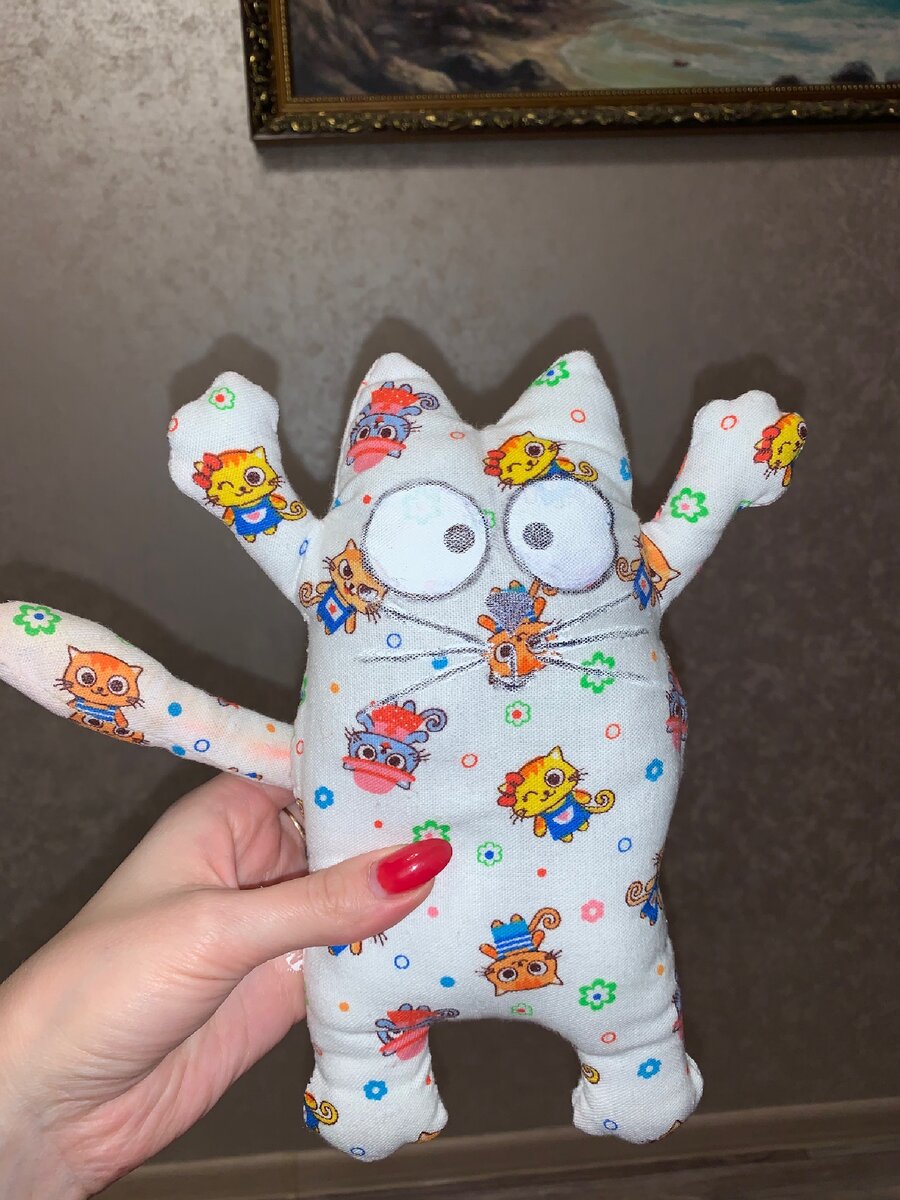 Когда ты мама троих детей, которые постоянно хотят чего то нового, интересного и необычного то приходится включать фантазию. Например, гуляя по улице нашего посёлка кто то детей увидел что в цветочном киоске продают мягкие игрушки, и одна из них была кот Саймон . Тот герой встречается в видеороликах в интерне, видео эти очень смешные и детям они нравятся . Дети конечно захотели такую игрушку , но цена за неё была очень завышена и кота уже хотел не один ребёнок а все трое . Тогда в избежании истерик и криков я пообещала сшить им кота дома. По дороге домой мы зашли в магазин тканей, где выбрали подходящую, с рисунком который понравился детям. Уже дома я нашла картинку кота Саймона, перерисовала ее в виде шаблона на лист форматом А4 . Вырезала шаблон . Затем я наложила шаблон на ткань и обвела . Как же я радовалась что у меня вроде бы в е получается, что я молодец )))) затем я вырезала два куска ткани и сшила их на машинке цветной стороной внутрь (нужно не сшивать до конца а оставить мес