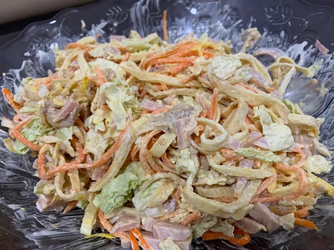 В предверии новогодних праздников хочется что необычное и новое . Нашла рецепт я где то в просторах интернета и сейчас я поделюсь им с вами... - корейская морковь - вареная курица - ветчина - пекинская капуста - блин ( 3 яйца , 3 ч. л. крахмала и 3 ч. л. муки, соль. Все взбить и выпекать блины. Затем каждый блин свернуть в рулетик и нарезать, получается как кольца кальмары по виду ) - майонез Такой салат конечно очень питательный но какой он вкусный, обязательно как нибудь попробуйте.