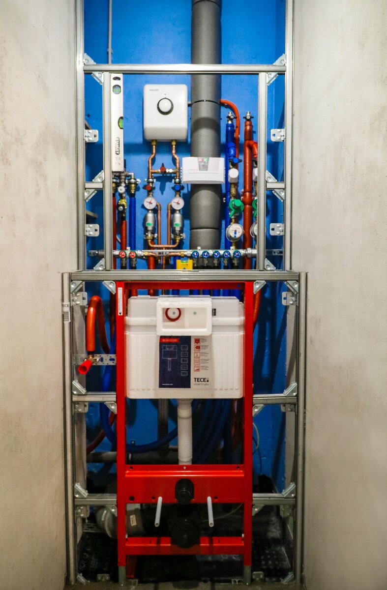 Монтаж сантехники в квартире: водоснабжение и водоотведение: В этом видео затронем тему качественной инженерной сантехники и постараемся дать ответ на вопрос: зачем необходима такая сложная система водоснабжения в квартире? Вот так выглядит сантехнический узел на нашем объекте до момента его дальнейшей отделки. По проекту инсталляция вынесена вперед на 20 см и над ней разместится полка для аксессуаров и туалетных принадлежностей. Стильное решение, но этой задумки есть один минус: для открытия люка, который будет расположен над полкой, придется убирать все принадлежности. Для того, чтобы «вынесенная» от капитальной стены инсталляция была жестко закреплена и удерживала любые нагрузки, мы использовали специальный самонесущий сантехнический профиль. И уже в собранный жесткий каркас устанавливается инсталляция, которая интегрируется и фиксируется с помощью угловых элементов. Теперь эта конструкция выдержит и слона 🐘 [маленького]. Надежная система водоснабжения квартиры. В этой квар