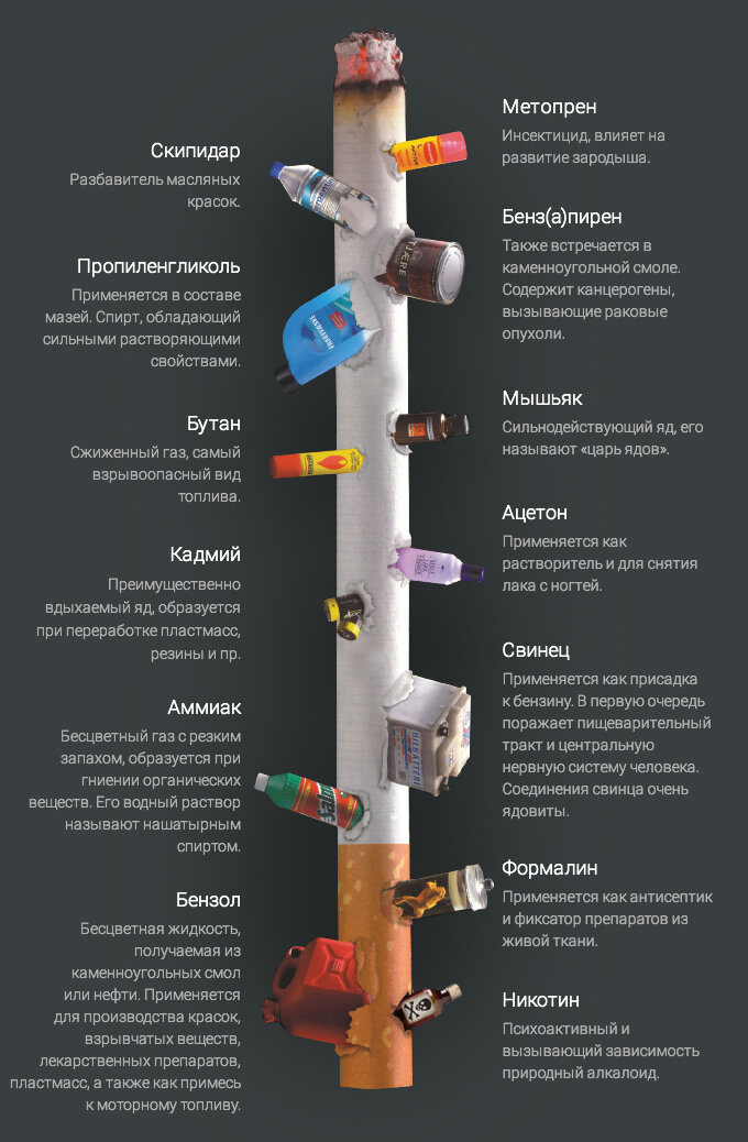 Табак – единственный натуральный алкалоид, который содержит никотин: психоактивное и вызывающее зависимость вещество. Потребление табака не является натуральной физиологической потребностью. В организме человека отсутствуют природные механизмы защиты от никотина и прочих ядов, получаемых при употреблении табака, включая многие канцерогены – вещества, вызывающие рак. Табачный дым образуется при курении в процессе сгорания табака, в ходе чего выделяется более 4000 химических веществ и соединений. Больше всего вредят здоровью никотин, угарный газ, смолы, соли тяжелых металлов и остаточные вещества, возникшие при сгорании. Более 40 химических соединений вызывают или способствуют онкологическим заболеваниям. Помимо вызывающего зависимость никотина, с табачным дымом как при активном, так и при пассивном курении в организм попадает множество химических соединений. При курении опасные вещества выделяются и в окружающую среду, вредя здоровью всех находящихся поблизости людей. Большая часть прои