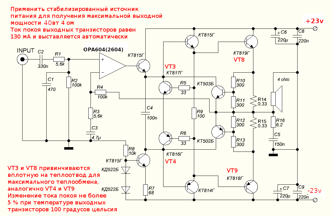 Усилитель напряжения выполнен на скоростном ОУ ора604 с сравнительно высоким номинальным напряжением питания (до 24 в), это позволяет получить размах выходного сигнала достаточным для получения выходной мощности 40 вт на нагрузке 4 ом. ОС по току выполнена на транзисторах VT3 VT4, они следят за изменением постоянного напряжения между базами VT8 VT9, при его увеличении транзисторы ОС приоткрываются, уменьшая тем самым напряжение между базами VT8 VT9, при уменьшении наоборот, стабилизируя таким образом ток покоя на заданном уровне. Стабильность тока покоя при таком решении очень высока и практически не изменяется при любых температурах транзисторов оконечного каскада, что выгодно отличает этот метод от обычной термокомпенсации. Ток покоя формируется автоматически и зависит от величин напряжений БЭ транзисторов VT3 VT4 VT8 VT9 и падений напряжения на резисторах R14 R15 (UбэVT8+Ur14+Ur15+UбэVT9 = UбэVT3+UбэVT4). Если VT3 VT4 заменить на кт814 и кт815 ток покоя увеличится до 800 мА из-за ра
