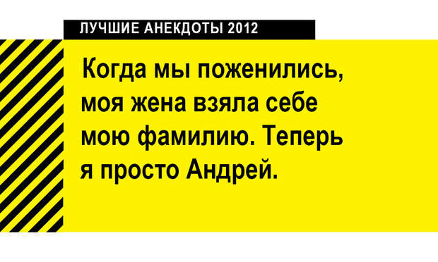 Третий выпуск грандиозного литературно-образовательного цикла «Лучшие анекдоты десятилетия». Да, в 2012 году люди уже умели смеяться. Мы раздали всем работникам MAXIM анекдоты, напечатанные в журнале в 2012 году, и потребовали отобрать только самые смешные. Получилось вот что. Извини. — Дорогой, скажи, меня эти джинсы не полнят? — Ты не обидишься, если я скажу правду? — Нет. — Я сплю с твоей сестрой. **** Гитлер все-таки был не самым плохим человеком, ведь это именно он убил Гитлера. **** В Антарктике найдена нефть. Кровавому режиму пингвинов недолго осталось мучить свой народ. **** — Ребе, я еду в Одессу, курортный город. Я слышал, что девушки там одеваются не так, как у нас в местечке. Скажите, ребе, а можно мне смотреть на женщину, если она в мини-юбке или в блузке с декольте? — Можно. — А если она на пляже и в бикини? — Можно. — А если топлес? — Можно. — Ребе, а есть такие вещи, на которые еврею нельзя смотреть? — Есть. — Какие, ребе? — Например электросварка. **** Перекати-поле —