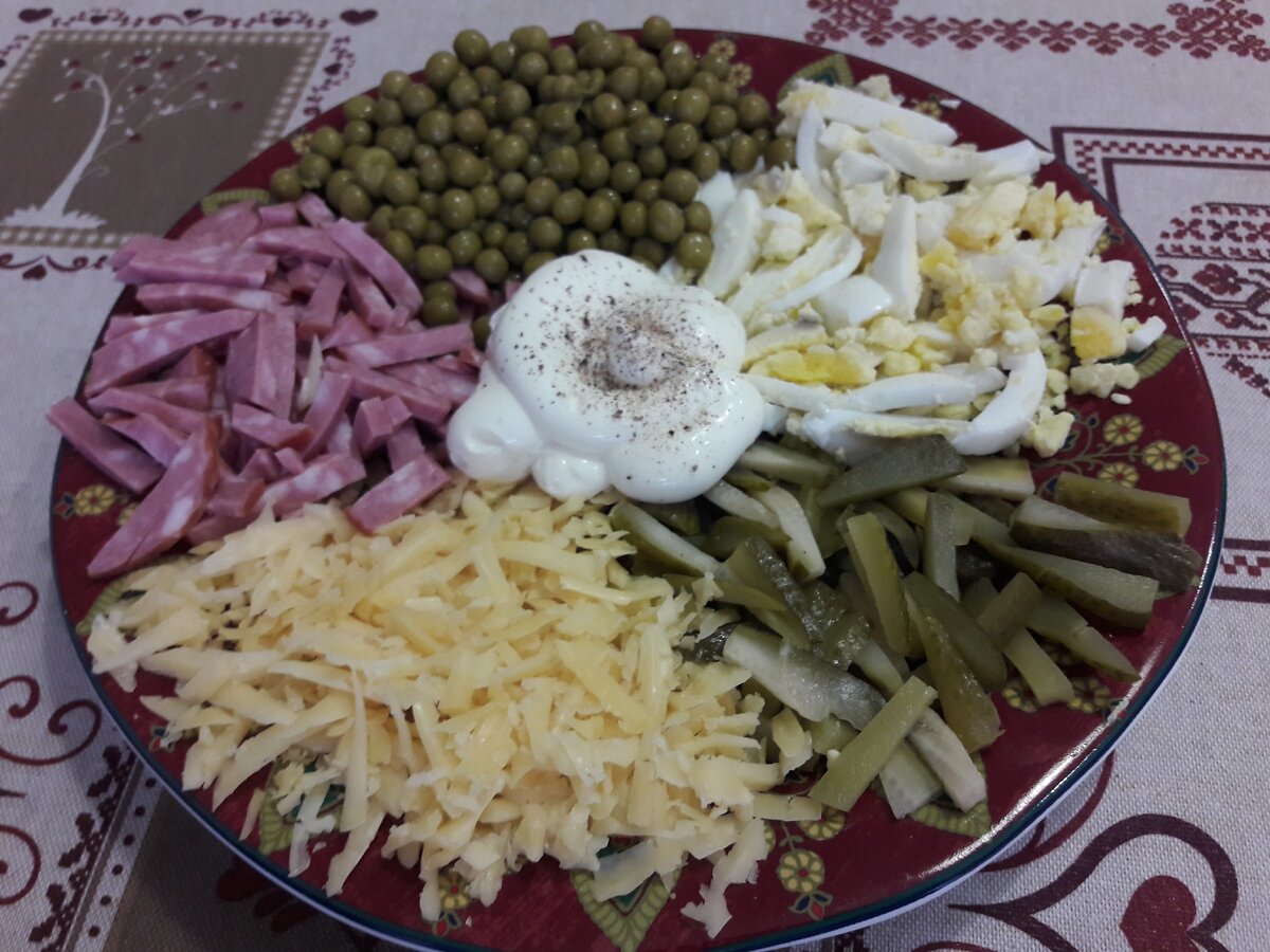 Очень красивая, праздничная подача и замечательный вкус! Готовится очень быстро и легко. Нам потребуется: Яйца варёные - 2-3 штуки Маринованные огурцы - 4-5 штук Копчёная колбаса - 150 гр Сыр - 100 гр Зелёный горошек - 2/3 банки Майонез - 2-3 столовых ложки Перец Способ приготовления: Яйца отварить и порезать. Сыр трём на крупной тёрке Колбасу порежем небольшой соломкой Так же поступим и с огурцами Разложим красиво все ингредиенты на плоской тарелке, в середину кладём майонез, чуть присыпаем перцем. Я не солю салат, все ингредиенты солёные, кроме яиц и соли получается достаточно. Подаём готовый салат к столу! Перемешиваем после того, как все гости сядут за стол! Всем приятного аппетита!