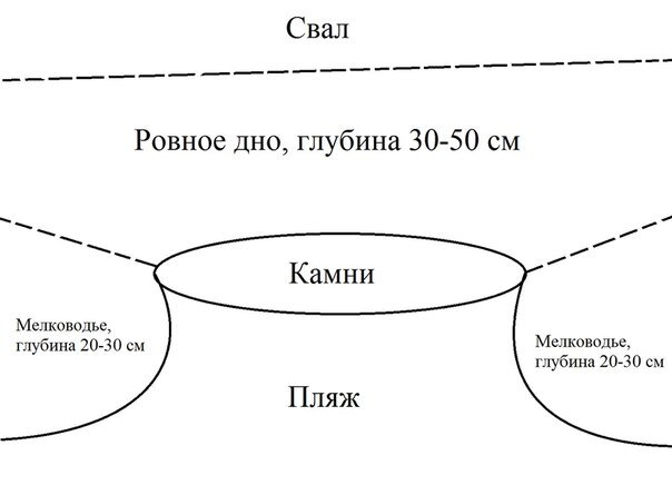 Первое место – искусственно насыпанная гряда камней, находящаяся в воде. Ловля ведется прямо с камней. Глубина сразу же идет примерно 30-50 сантиметров и продолжается еще метров 30 в глубину, потом уже идет медленный свал. Дно усеяно ракушками и камнями. По краям гряды мелководье, на границе мелководья и ракушечника чаще всего происходят поклевки.