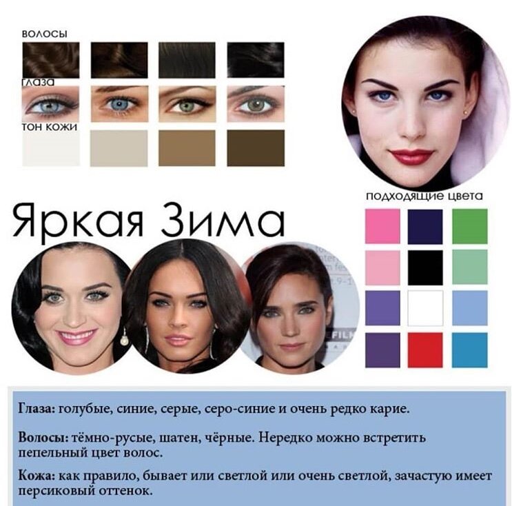 Характеристики цветотипа ЗИМА Признаки во внешности: отличительной чертой данного колорита является контрастность. Девушки с типом внешности Зима выглядят очень эффектно и необычно. У них чётко прослеживается контраст тона лица с цветом волос. Именно контрастность является ключевым показателем. Подходящие цвета: зима относится к самому контрастному колориту, как правило цвета Зимы — это темные и глубокие, синий, серый, черный. Избегать стоит горчичных, желтых, и приглушенных оттенков. Данный колорит делится на три типа: на тёмную, холодную и яркую Зиму. Яркая Наиболее эффектный тип внешности, так как он обладает наиболее высокой контрастностью между составляющими внешнего облика. Яркость служит главным ориентиром. Холод прослеживается во всем, при этом частички тепла в данном случае встречаются крайне редко, ведь они совершенно несвойственны данному цветотипу. Холодная Колорит Холодной Зимы характерен в основном фарфоровой кожей, или кожей с явно розоватым отблеском. Холодность данног