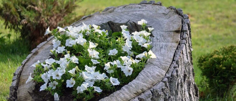 Редко встретишь сад, на котором не было бы пней. Особенно вновь купленный участок изобилует ими. Иногда не нужно торопиться выкорчевывать оставшиеся спилы, а попробовать их вписать в интерьер сада. Например использовать их вместо кашпо. Для этого всего лишь нужно выпилить или выдолбить в коряге сердцевину. Если пень попался с трухлявой сердцевиной, это еще один плюс, ее легче будет удалять. Наоборот, если середина пня крепкая, тогда выдолбите небольшое пространство и засыпьте его аммиачной селитрой, а сверху прикройте обычной землей. Это ускорит разложение крепкой части пня. Также необходимо просверлить отверстия чтобы не застаивалась лишняя вода. Чтобы избежать гниения пня, его нужно обработать специальным антисептиком. После всех манипуляций посадить туда цветочки и будет вам красота. Главное учесть особенности высаживаемых растений, сколько им нужно места для полноценного развития, чтобы корешкам не было тесно. В таком кашпо будут великолепно смотреться живучка ползучая, гвоздика-т