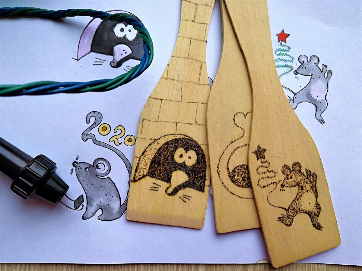 В этом году я долго думала, чтобы такое придумать не дорогое , но симпатичное для подарков на Новый год. И чтоб сделать быстро, а не так как прихватки в прошлом году, которые требовали время, сил для пошива. И вот, как то прогуливаясь по городу зашла в Галмарт( есть у нас такой магазинчик, где продают всякое дешёвое из Китая). Моё внимание привлекли деревянные лопаточки..всего то за 9 рублей. Лопаточка сама по себе очень полезная вещь на кухне. Я, например, всегда ею пользуюсь, когда готовлю оладьи или блины. Но подарить лопаточку в подарок это как то сильно просто, меня не поймут . И тут меня осенило. Я недавно рисовала мышек для Шаттерстока. -Почему бы и не воспользоваться идеями?-подумала я Где то дома у меня лежал ещё с детских времён выжигатель. Сейчас они тоже продаются в магазинах. Дело пошло очень быстро, копиркой перевела на лопаточку и выжигателем очень быстро обвела. Даже не имея навыков выжигать, я справлялась очень быстро, на одну лопаточку уходит от 10 до 15 минут. Пр