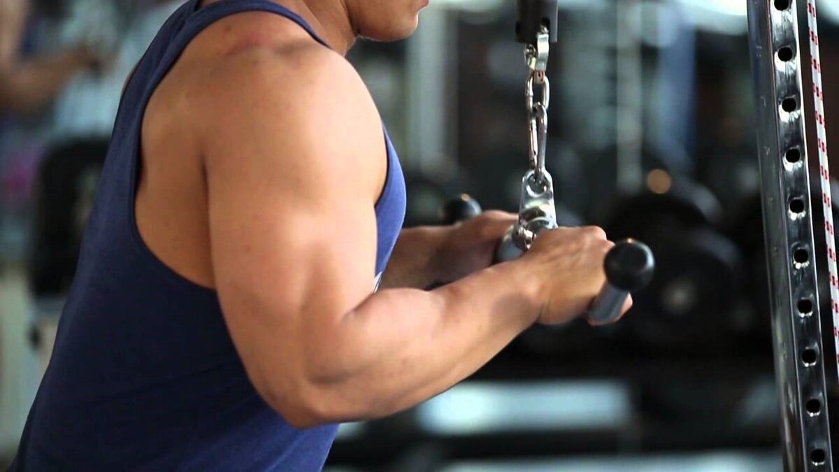(читайте здесь: часть 1, часть 2, часть 3) Кроссовер является профессиональным многофункциональным и универсальным устройством для всех мышц. Несмотря на все преимущества тренажера, не забывайте, что программа должна состоять в большей части из базовых упражнений со свободным весом, в остальном – на тренажерах. Разгибание рук на верхнем блоке стоя обратным хватом. Упражнение эффективно прорабатывает латеральную головку трехглавой мышцы плеча и предплечья. Недостаток техники заключается в сильной нагрузке на большие пальцы рук. Разгибание рук с верхнего блока. Данное упражнение можно назвать самым эффективным для тренировки трицепса в кроссовере. Это упражнение позволяет прорабатывать все головки мышцы, а акцент на конкретный пучок осуществляется с помощью различных постановок рук на грифе-рукояти (средним, узким или вертикальным хватом). Также упражнение можно выполнять при помощи рукояти-каната. Такой способ позволяет тренировать латеральную часть мышцы. Это упражнение придает три
