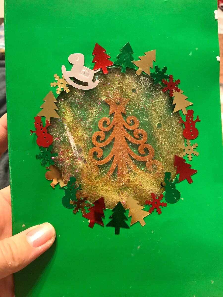 Делали эти открытки с детьми вместе. 3 летке, конечно, пришлось сильно помочь, а вот 8 летний справился полностью сам. Для открытки понадобятся: 2 листа цветного картона обложка для учебника скотч блестки любой декор на ваш вкус вода с глицерином/масло/гель для душа прозрачный (наш вариант, хорошо, что муж не видел). Мы сложили лист картона пополам, вырезали кружочек. Из обложки для учебника при помощи скотча «запаиваем кармашек» с 3 сторон. Через свободный наливаем выбранную жидкость и добавляем блестки. Приклеиваем внутри по стороне отверстия, сверху прикрываем рамочкой, дабы спрятать конструкцию (у нас не совсем попало в размер, но в условиях боевых и так нормально). Осталось только приклеить главный элемент композиции напротив «окошка». У нас это елочка из фетра. Но вариант может быть любой. Снеговик, дед мороз, подарочек, олень, пингвин (мне кажется может быть очень мило). Вуаля, ваша открытка антистресс готова. Блестки будут равномерно распределяться, а вы пальцем можете разогн
