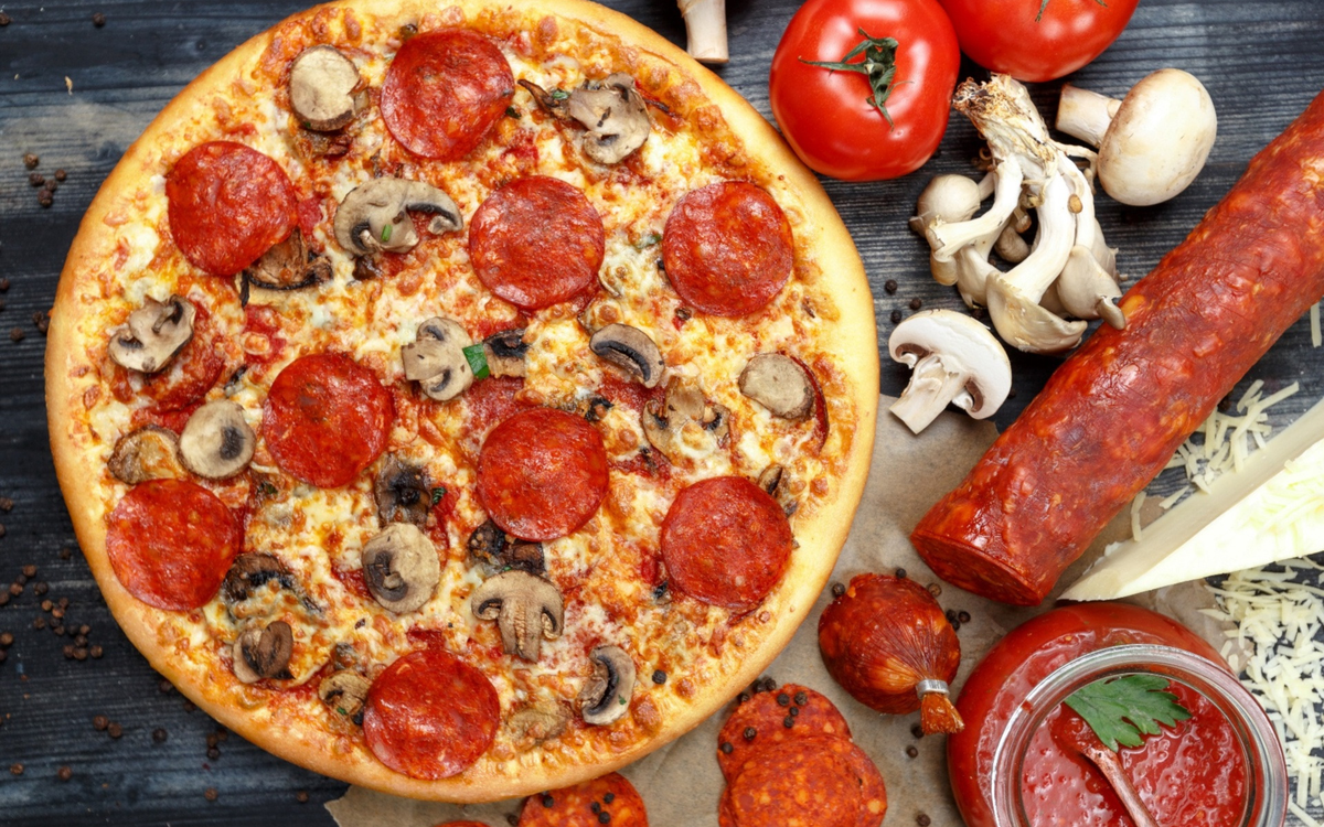 Пицца очень проста в приготовлении и не требует работы с тестом. нам понадобиться: 1.заготовки для пиццы 2.кетчуп и майонез 3.2 или 3 вида колбасы я добавлял одну с запахом дыма,а одны просто копчённую 4.кукуруза 5.шампиньоны (по желанию) 6.сыр (я беру обычно который пожелтее) Начнём!!!!! На заготовку нальём кетчуп и майонез и всё перемешаем. Затем порезанную колбасу высыпаем в хаотичном порядке не жалея ингридиента,чем больше начинки тем будет вкуснее и сытнее.Теперь если нужно положите грибы,но перед этим обжарить(10мин.на маленьком огне),выкладываем на пиццу,затем кукурузу,и потёртый на крупную тёрку,но если натереть на самую мелкую то сыр расплавится очень хорошо и распространиться по всей поверхности пиццы.У меня обычно пицца стоит минут 10,но я перед этим прогреваю духовку на максимальной температуре всё это время пока выкладываю все ингредиенты. В итоге должно получиться что то на подобие А так всё зависит от фашей фантазии лично я пробовал с 3 видами колбас одновременно.Но