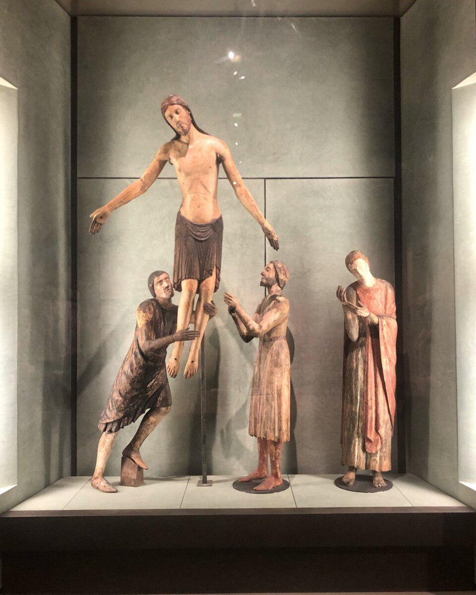 Снятие с креста, вторая четверть XIII века, Умбрия, Лувр. Объемные фигуры в натуральную величину из полихромной древесины тополя, ивы и ореха напоминают церковную скульптуру русского севера.