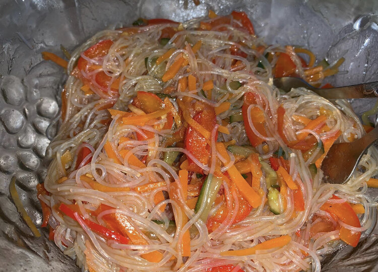 Я обжарила на оливковом масле морковь, потом перец добавила, потом огурец и помидоры. Все добавляется быстро, не зажариваем ! Лапшу фунчозу заливаем кипятком на 7-10 минут и все перемешать в салатной тарелке. (Сок от овощей не нужен! Фунчозу без воды добавлять ) соус у меня был с лапшой, но если нет то соевый соус и пару капель яблочного уксуса я думаю подойдут . Ещё можно добавлять курицу в овощи, но можно и без неё.