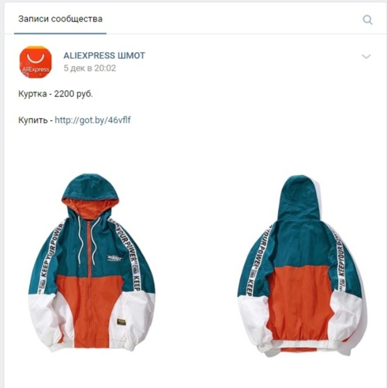 -На выходе у вас будет маленькая ссылка (это и есть ваша партнерская ссылка), теперь эту маленькую ссылку вы размещаете у себя в группе вместе с фотографией вещи, выглядеть должно вот так.