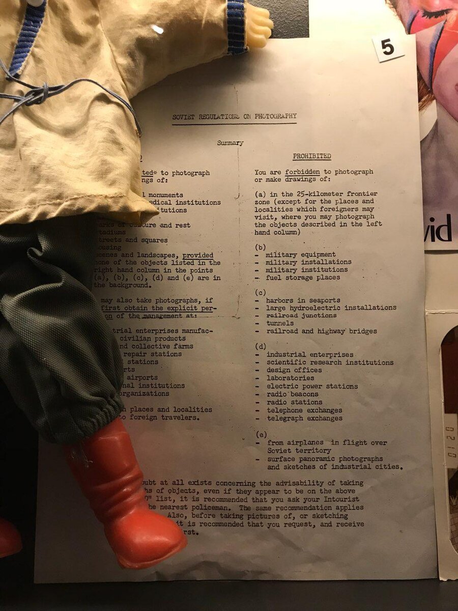 Набор правил что можно и что нельзя фотографировать в СССР, выданный Дэвиду Боуи и Джеффу МакКормаку во время их транссибирского путешествия через всю Россию в 1973 году. Материал выставки Dawid Bowie. Rock’n’roll with me в павильоне острова Новая Голландия. На переднем плане - марионетка, купленная Боуи в ГУМе. Для иностранцев в СССР запреты на фотографирование военных, научных, индустриальных, железнодорожных, энергетических и транспортных объектов распространялись и на их зарисовку.