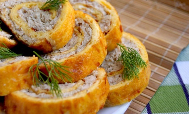 Куриные рулетикм: просто, быстро и очень вкусно! Понадобится Для омлета: 100 г любого твердого сыра 100 г майонеза 1 ст.л. манки 3 яйца Для начинки: 300-350 г куриного фарша 2 большие луковицы соль, перец Приготовление: Омлет: 1. Яйца, майонез, сыр (потереть на терке), манку положить в миску. 2. Перемешать до однородности. Дадим манке чуть-чуть разбухнуть, а сами займемся начинкой. Начинка: 3. Лук нашинковать и поджарить до прозрачности на растительном масле. 4. Затем сложим его в блендер и измельчим. 5. Соединим фарш, лук, соль и перец. Хорошо перемешаем. 6. Противень застелить бумагой и смазать раст. маслом. Вылить тесто. Печь при 180 С до небольшого зарумянивания 7. Убрать бумагу. Распределить фарш по всей поверхности омлета 8. Свернуть рулет 9. Обернуть рулет фольгой. Печь при 180 С 40 минут. Дать остыть в фольге, чтобы весь сок, который вытек, впитался в рулет. Нарезать и можно кушать горячим или холодным. Смотрится празднично и вкус соответствующий! Думаю, гости