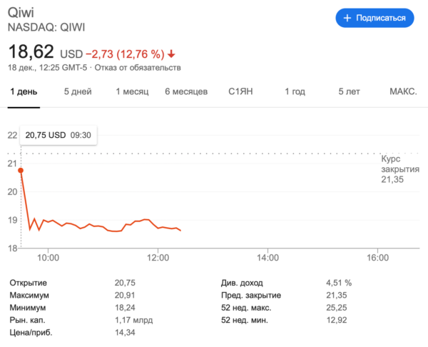 Акции Qiwi на фондовой бирже Nasdaq на 20:25 мск подешевели на 12,76%. Котировки снизились после новостей об уходе сооснователя компании Сергея Солонина с должности гендиректора. Стоимость одной акции Qiwi составила $18,62. Рыночная капитализация компании упала до $1,15 млрд против $1,32 млрд 17 декабря. Солонин занимал пост гендиректора Qiwi с 2012 года. Его место займёт сооснователь компании Борис Ким. Солонин возглавит совет директоров вместо Кима и сосредоточится на долгосрочной стратегии и развитии новых бизнес-моделей и ниш, заявили в компании.
