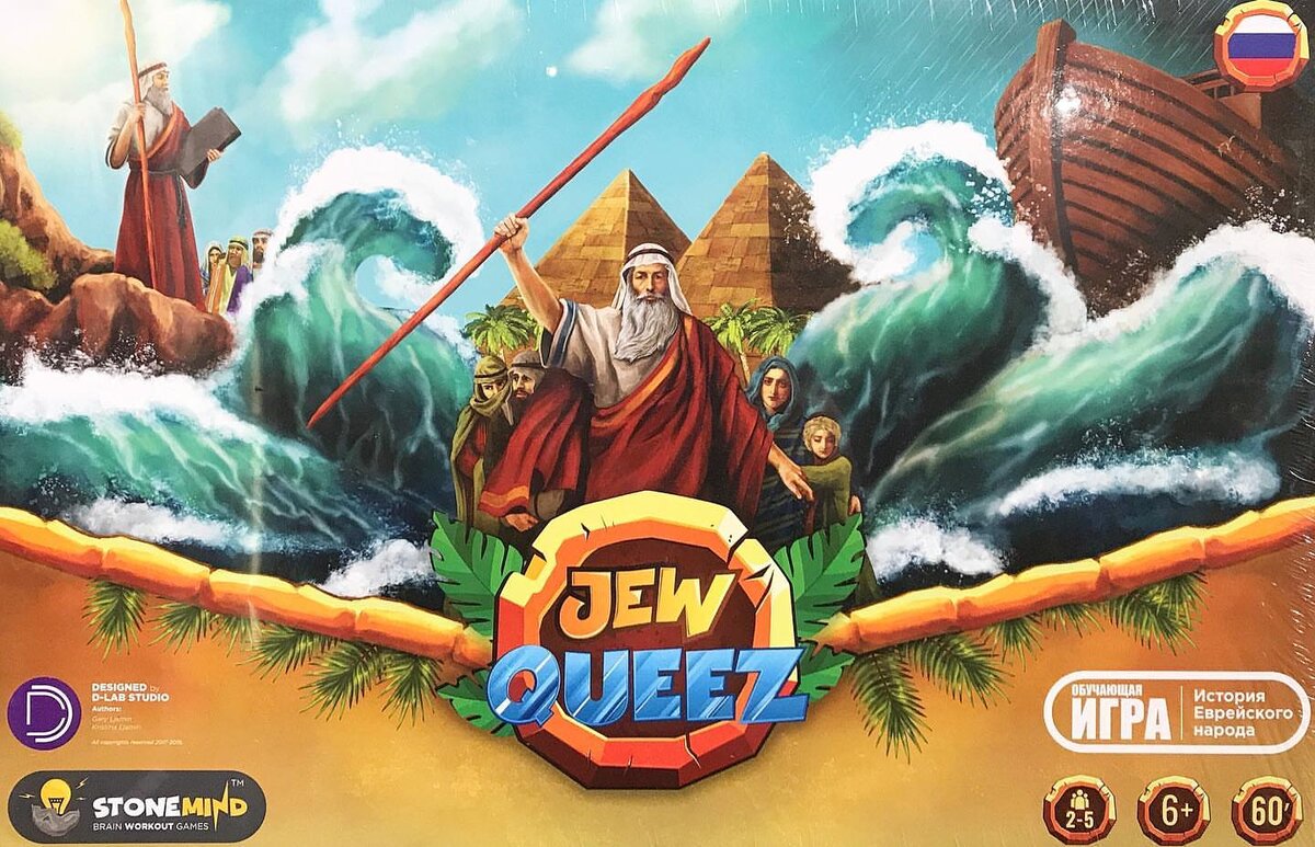 JewQueez – это обучающая и увлекательная игра – викторина, которая поможет ввести игроков в мир Еврейской истории и традиций, обеспечив содержательную преемственность учебного материала через игровую форму.Игра рассчитана как на учеников общеобразовательных учебных заведений, в которых изучается традиция еврейского народа, так и для лиц, интересующихся еврейской культурой и бытом. Игровой набор JewQueez cостоит из более чем 200 элементов, которыеделают ее очень интересной и познавательной. В наборе 219 игровых карточек, которые делятся на 3 разные категории. Также имеются бонусные карточки и вопросы. В игре 5 уникальных персонажей: Давид, Мордехай, Рахиль, Ной, Иаков. Чтобы ответить на вопрос, у каждого игрока есть всего 30 секунд. Красочная, складывающаяся пополам игральная карта отражает в себе еврейский календарь и основные события каждого месяца. Специальный дрейдл имеет на своих сторонах: א, ב, ג, ד. Каждая буква равна количеству ходов, которые делает игрок. В комплекте имеется