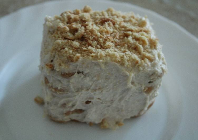 2. Выложим печенье и смажем творожной массой. Сделайте таким образом нужное вам количество "этажей". В конце можно измельчить печенье и насыпать сверху, а также обмазать бока остатками творожной массы.