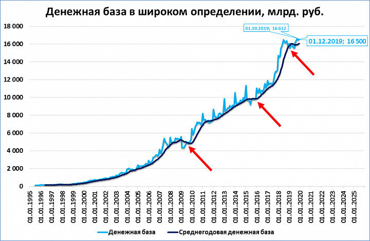 На 1 декабря широкая денежная база достигла 16,5 трлн. рублей. График 1. Это близко к историческому максимуму, установленному два месяца назад (1 октября; 16,6 трлн. рублей). В реальном выражении, с учётом инфляции, положение уже не такое радужное. График 2. Денежная база в реальном выражении уже полтора года не может преодолеть максимум, показанный в июле 2018 года. Но есть и позитивная новость: впервые с марта 2019 года денежная база показала рост в реальном выражении за 12 месяцев. График 3. Это может быть началом цикла роста денежной базы. Но возможен и негативный сценарий по образцу 2008 года. Он показан на графике 4 (это тот же график 3, но в другой форме). График 4. Тогда, в 2008 году, после нескольких месяцев падения денежная база тоже показала рост (см. точку 1 на графике 4).Но затем падение возобновилось с новой силой. В этот раз (см. точку 2 на графике 4) возможно повторение того же сценария. Позитив подтвердится, если среднегодовая динамика развернётся в сторону роста (то