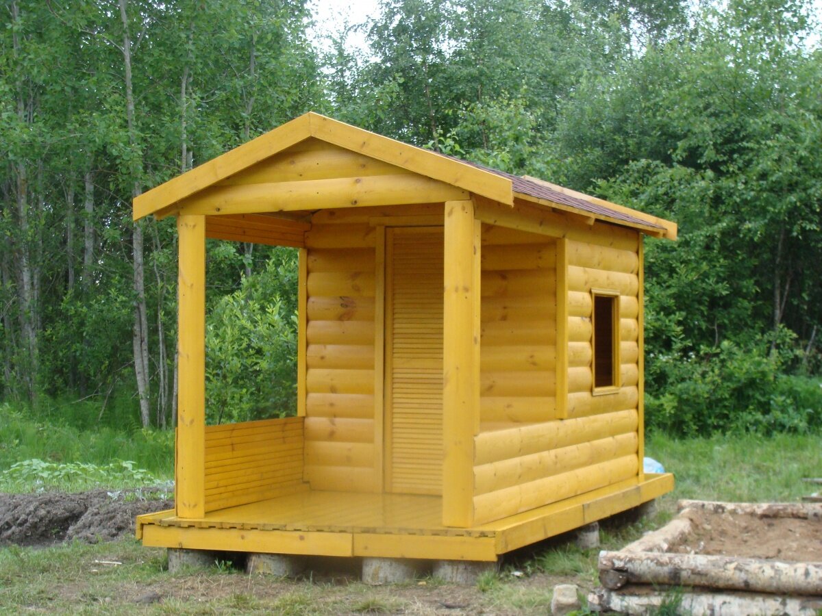 Детский домик своими руками изготавливается из таких материалов: Первым делом создается чертеж детского домика своими руками. Он будет иметь веранду и 1 комнату с окошками и дверью. Начинать строить дом необходимо с основания, которое будет выполнять функцию пола. Шпунтовая доска соединяется с помощью гвоздей и крепления шип-паз к трем лагам. Затем создается каркас будущего домика из брусков, которые закрепляются металлическими уголками. Следующий этап – облицовка. Для этого выбран «Блок Хаус» — материал, напоминающий внешне деревянный сруб. К тому же он достаточно жесткий. Важно! Чтобы не повредить шпунт при соединении «Блок Хауса», лучше использовать обрезки материала и молоток. Внешние углы детского игрового домика своими руками закрываются деревянными уголками. Крыша покрывается обрезными досками, которые крепятся с каждой стороны двумя гвоздями. Настил делается из битумной черепицы. Готовый детский домик из дерева своими руками обрабатывается «биотексом», который будет защищать е