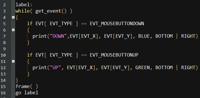 С 3 по 14 строку у нас идёт цикл, который будет выполняться, пока функция get_event() фиксирует какое либо событие (пока возвращает 1).