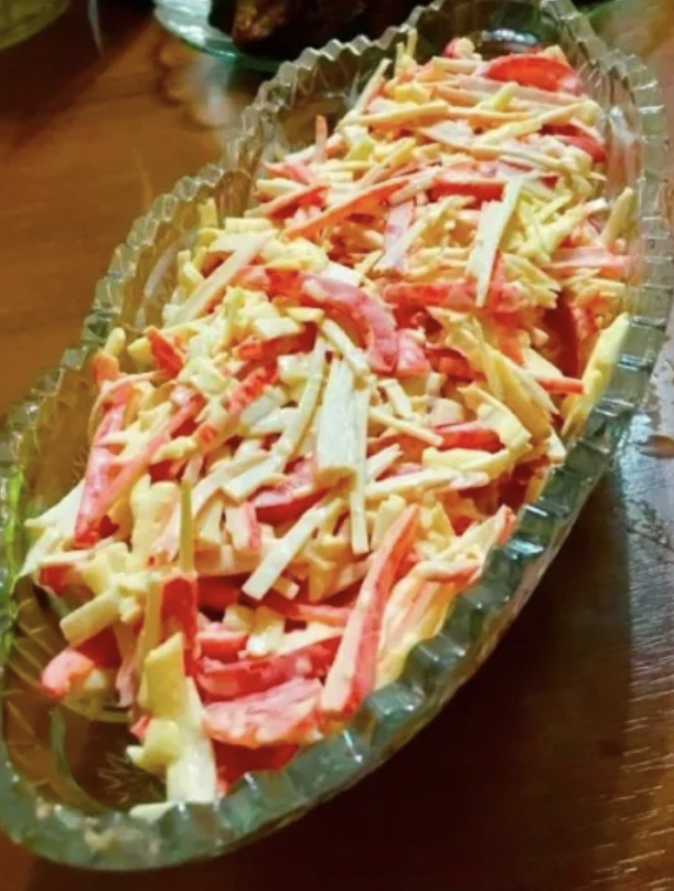 Попробовала я этот салат у своей подруги, когда ездила к ней на день рождения. Салатик мне понравился! Ингредиенты: 200 г крабовых палочек Болгарский перец 4 средних помидора 70г твердого сыра Чеснок Майонез Приготовление: Для начала нам понадобится 200 г крабовых палочек. Нарезаем их тоненькой соломкой. Крабовые палочки лучше брать хорошего качества, чтобы салат получился вкусный. Далее берём болгарский перец, отрезаем половину и также нарезаем тонкой соломкой. Потом нам понадобится четыре средних помидора. Разрезаем их пополам ,ложкой убираем сердцевину, а оставшуюся часть нарезаем тонкой соломкой. Далее берём 70 г твёрдого сыра и натираем на крупной тёрке. Все подготовленные ингредиенты складываем в салатник, добавляем несколько зубчиков чеснока, пропущеных через пресс, также кладём пару ложек майонеза и всё тщательно перемешиваем. Можно отдельно смешать майонез с чесноком, а потом уже добавить к салату Ну вот и всё салатик готов. Получается он очень вкусный сочный и аппетитный!)