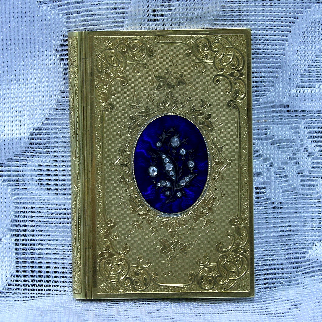 Блокнот для Леди (Бальная записная книжка), Европа, XIX век (надпись гравировкой на корешке «1861 Neuchâtel 10 septembr»), золото 14 карат (56 проба), ювелирная резьба штихелем по золоту, общий вес 64,2 грамма, клейма нет, 18 бриллиантов дореволюционной огранки «Роза», горячая эмаль, карандаш утерян, бархат, блок записной книжки восстановлен современный.