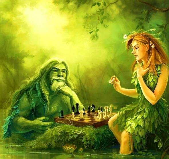 Впереди у самой кромки лесного озера движется собранная из ветвей фигура. Длинные лозы дикого винограда заменяют руки, ребра сделаны из выбеленных солнцем ветвей дуба без коры. Позвоночник — гибкая ветвь с множеством коротких сучков с сочными листками. Голова существа покрыта изумрудной травой, опускающейся, подобно водорослям, до плеч. Ноги собраны из толстых брёвен и уходят в юбку из бурого мха.