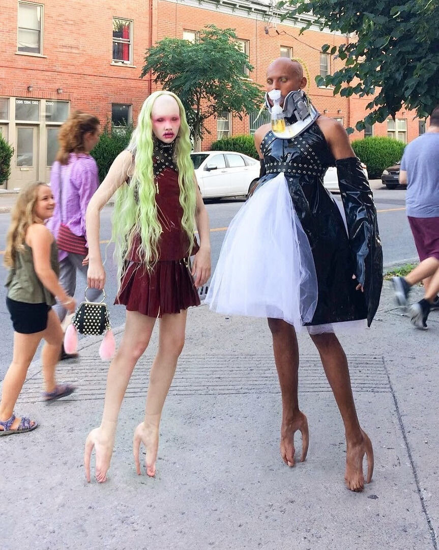 Двое канадцев удивляют своих подписчиков в инстаграме необычными нарядами и макияжем, делающими из них то ли зомби, то ли инопланетян. Выглядят такие образы жутковато, но их авторы говорят, что преследуют важную цель: рассказать людям о том, как важно действительно любить то, что ты носишь, вне зависимости от бренда. Людей на этом фото зовут Ханна Роуз Дальтон и Стивен Радж Баскаран, и если вы не очень понимаете их возраст по фото, то девушке 22, а парню 24. В подобных нарядах, как пара рассказала Vogue, они ходят практически всегда, за исключением тех случаев, когда, например, занимаются спортом. Пара говорит, что люди реагируют на них по-разному. Например, в Лондоне некоторые прохожие подходят к ним и просят сфотографироваться, благодарят за то, что они выделяются из толпы своим оригинальным стилем. А вот на улицах Парижа в них несколько раз плевались. Однако Стивену и Ханне, по их собственным словам, не важны лайки и одобрение. Инстаграм они заводили для того, чтобы продвинуть сво