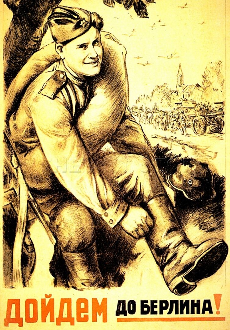 Умели при Иосифе Виссарионыче в наглядную агитацию. Плакаты военного времени можно смело считать образцом доходчивости и наглядной агитации. Просто, емко, четко, по делу и впечатляюще. Но сегодня мы поговорим не о плакатах вообще, а о герое двух весьма известных плакатов. Точнее, если уж совсем справедливо – трех. Причем один был, так сказать, импортным. В 1944 году был выпущен плакат «Дойдем до Берлина», на котором бравый солдат, натягивая сапог, обещал дойти до немецкой столицы. Плакат был создан художником Леонидом Головановым, изобразившим бравого бойца с эффектной шевелюрой и пилоткой набок. В дальнейшем, после окончания войны Голованов взял понравившееся изображение бойца для плаката «Красной Армии – Слава» (который часто также называют «Дошли до Берлина!», по аналогии с плакатом 1944 года и из-за надписи «Дошли», рядом героем). Кроме того, все тот же самый персонаж был нарисован на китайском плакате «Слава Красной Армии». Этот плакат появился после разгрома японцев в августе