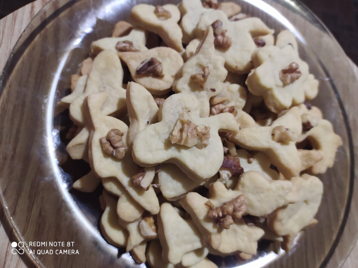 Я большая сладкоежка, но в последнее время немного устала от сахара, поэтому решила сократить его количество в меню, особенно в выпечке. Экспериментируя с разными пропорциями, я остановилась на варианте несладкого печенья, которое просто тает во рту. Такое угощение отлично подойдет к чаю или кофе для новогоднего или рождественского стола. Для печенья понадобятся следующие продукты: Сливочное масло – 1 пачка (180 г); Яйца – 2 шт.; Мука – 2,5 стакана; Сахар – 2 ч. л.; Соль – ½ ч. л.; Ядра грецкого ореха – 20 г. Сливочное масло предварительно нужно вынуть из холодильника и выдержать час-два при комнатной температуре. Затем размягченное масло нужно соединить с яйцами, сахаром и солью. Эту смесь довести до однородности. После этого добавить муку и заместить тесто. Разделите его на части, а затем поочередно раскатывайте скалкой каждую часть и вырезайте печенье. Для праздничной выпечки я пользуюсь фигурными формочками, но стаканчиком или рюмкой – тоже неплохо. Если хотите получить сухое хру