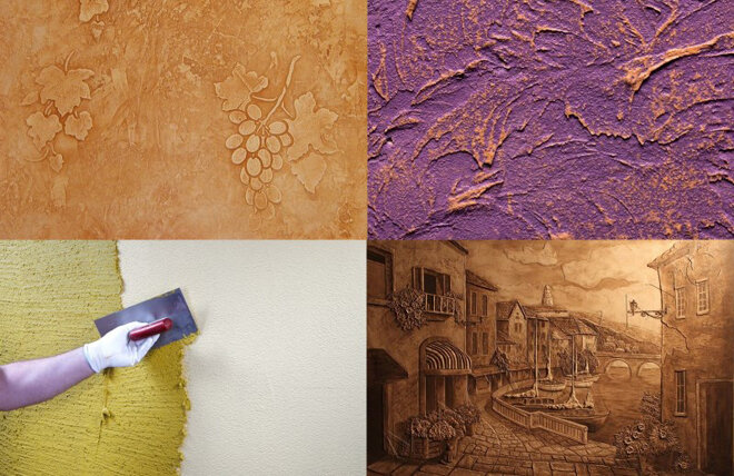 Они создаются с использованием декоративной штукатурки. Материал по внешнему виду имитирует металл, мрамор или другие уникальные покрытия. Иногда выбирается винтажная штукатурка, создающая эффект ржавчины или потертостей.
