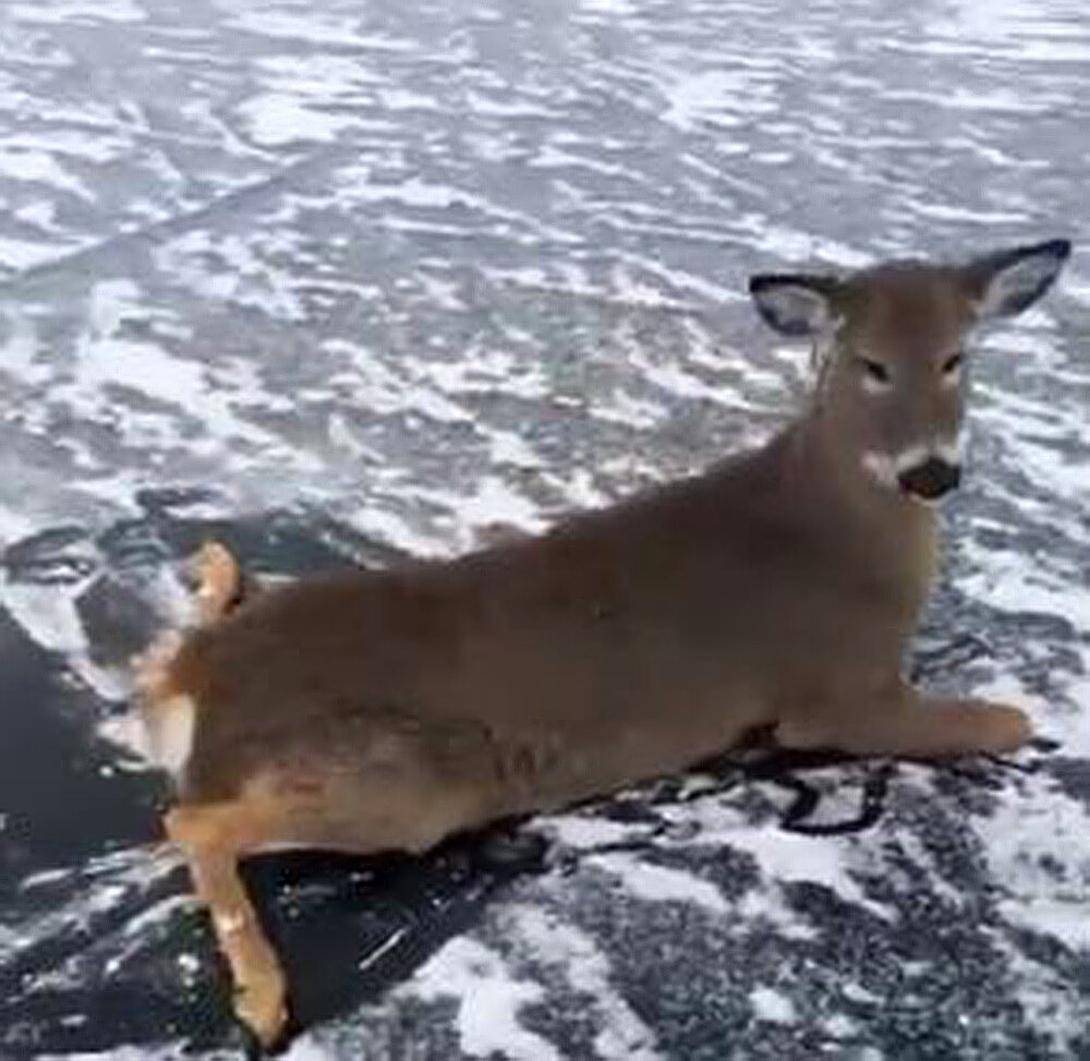 В общем, тут такое дело, которое произошло в Канаде. Как-то холодным зимним вечером, озеро неожиданно застыло крепким льдом. Мороз сковал воду и по нему решили проходить местные животные, животные оказались олени - в прямом смысле слова. Олени как и другие копытные, на скользкой поверхности ведут себя как коровы на льду. Копытные на льду Хотя другого, от них ожидать не придётся, ведь они копытные. А все копытные на гладком льду передвигаться нормально не могут. Утром в выходной день, один мужик собрался покататься на коньках, по гладкому первому льду замерзшего озера. И тут, он заметил вдали несколько крупных силуэтов. Это оказались олени. Подъехал ближе он понял, что животные уже измучены и не в состоянии сами добраться до берега, так как ноги разъезжаются. Буксир В общем, наш герой добрался до берега и сходил домой за большой верёвкой. Этой верёвкой он по очереди обматывал оленей и буксировал до берега. Буксир на два! Берег Подъехав на метр к берегу, снял хомуты с шеи живот
