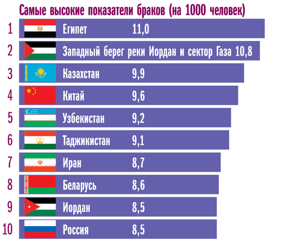Очередной выпуск нашей рубрики, где графики, сухим языком столбиков и линий рассказывают об удивительных вещах! Статистика по бракам — отличный способ понять культуру взаимоотношений в какой-то стране. С одной стороны, ужасаешься, что в Судане средний возраст невесты — 14 лет. С другой — тому, что самый большой процент разводов именно в России. Но тут не все так просто. Больше всего жениться любят в исламских республиках (включая те, которые когда-то входили в СССР с юга), а также в Китае. При этом в исламских странах браки очень стабильные, разводятся там довольно редко. А в Китае уже начался естественный убыток населения, поэтому женитьба там — это, скорее, ритуал. Разводиться в Китае любят. Но чаще всего разводятся в России. И в сочетании с частыми браками это означает, что вступать в брак нам нравится больше, чем там находиться. А самые большие ненавистники браков живут в Латинской Америке. Мыльные оперы только тому подтверждение: выходить замуж после ухаживания короче двух сезонов