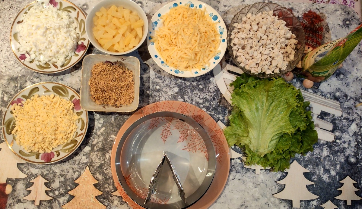 и после сборки салата посадить по середине салата мышку. Для украшения понадобится лист салата и душистый перец,чтобы сделать глазки и носик мышкам. Ингредиенты: - Курица 400гр. - Майонез 300гр. - Сыр 200гр. - Яйца 7шт.(2 из них на украшение) - Ананасы консервированные 300гр. - Грецкие орешки (обжаренные) 100гр. - Соль,перец по вкусу. Приготовление: Курицу отвариваем до готовности и мелко нарезаем. С ананасов сливаем сок.Если у вас ананасы колечками,то их нужно порезать кубиками или купить сразу ананасы порезанные на кубики. Отвариваем все яйца в крутую. Из 5 яиц отделяем желтки и белки и натираем их на крупной терке. Два оставшихся яйца уйдут на создание мышек. Сыр натираем на крупной терке. Орешки обжариваем на сковородке и перемалываем в блендере. 1) На дно тарелки выкл